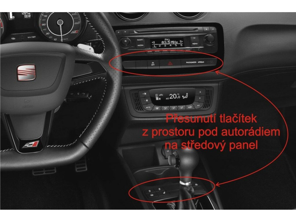 Součástí balení je kabelový svazek s originílními konektory pro posunutí tlačítek umístěných pod OEM autorádiem do středového panelu. Panel s tlačítky je originální díl Seat (shodný s modelem před Faceliftem 2014).