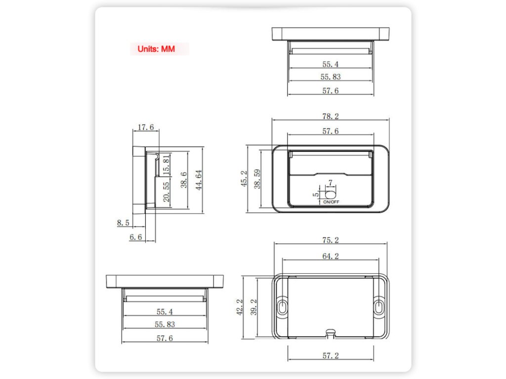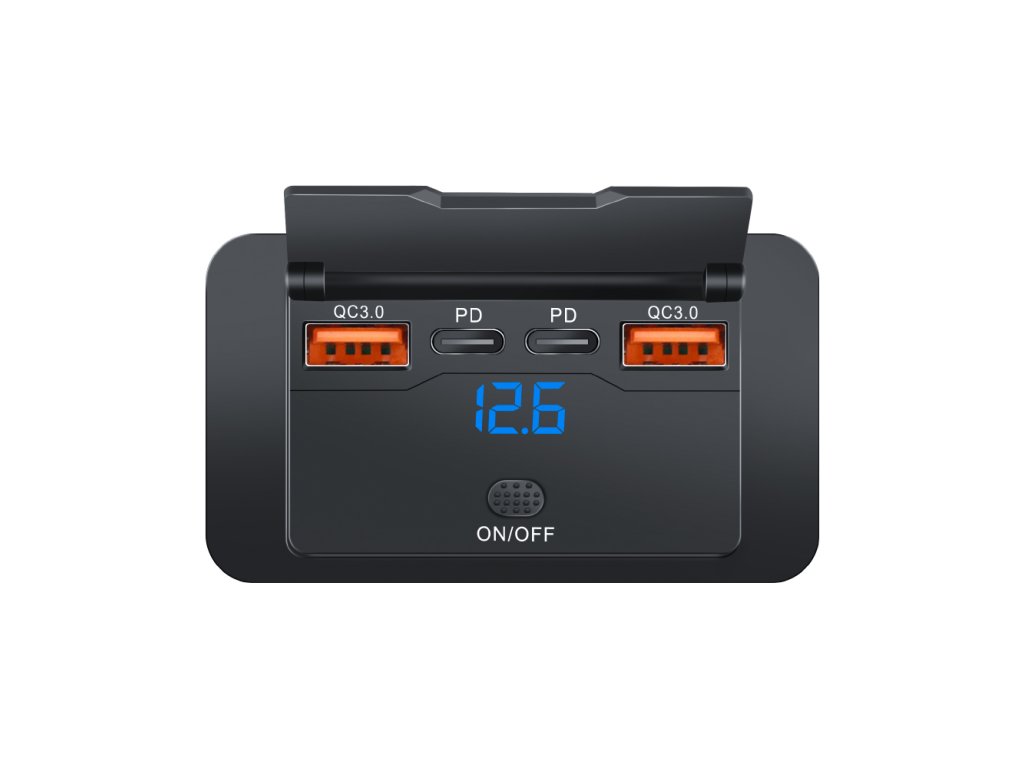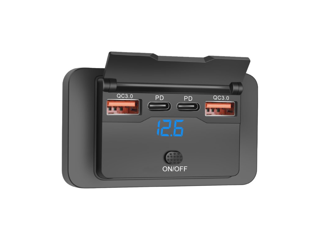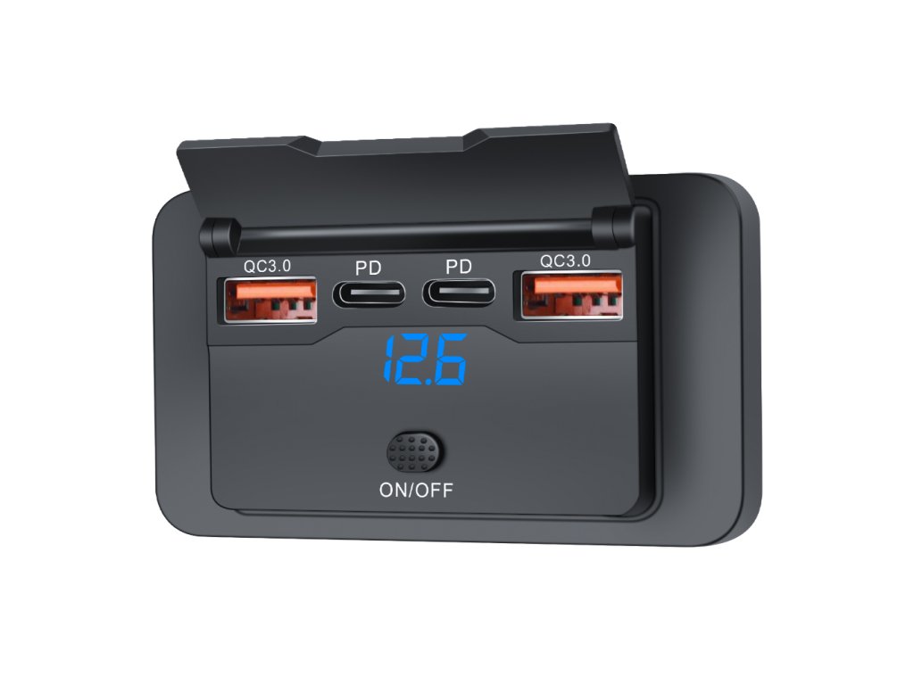 2x USB QC3.0 nabíječka + 2x USB C PD + voltmetr pro montáž na povrch, modrá LED indikace. Vypínač, který umožňuje vypnout zařízení při nepoužívání. (vypne se i voltmetr) Doplněno praktickou výklopnou krytkou konektorů.