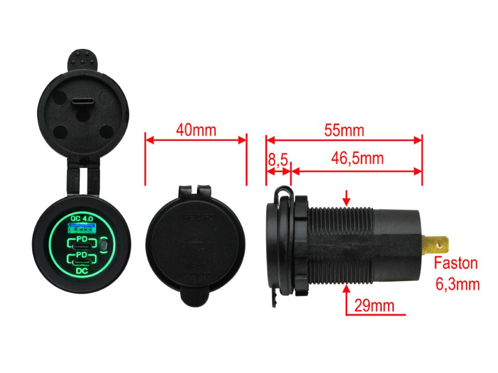 Měnič napětí 12/24V → USB-C QC4:PD + 1x USB-A- zelené podsvětlení