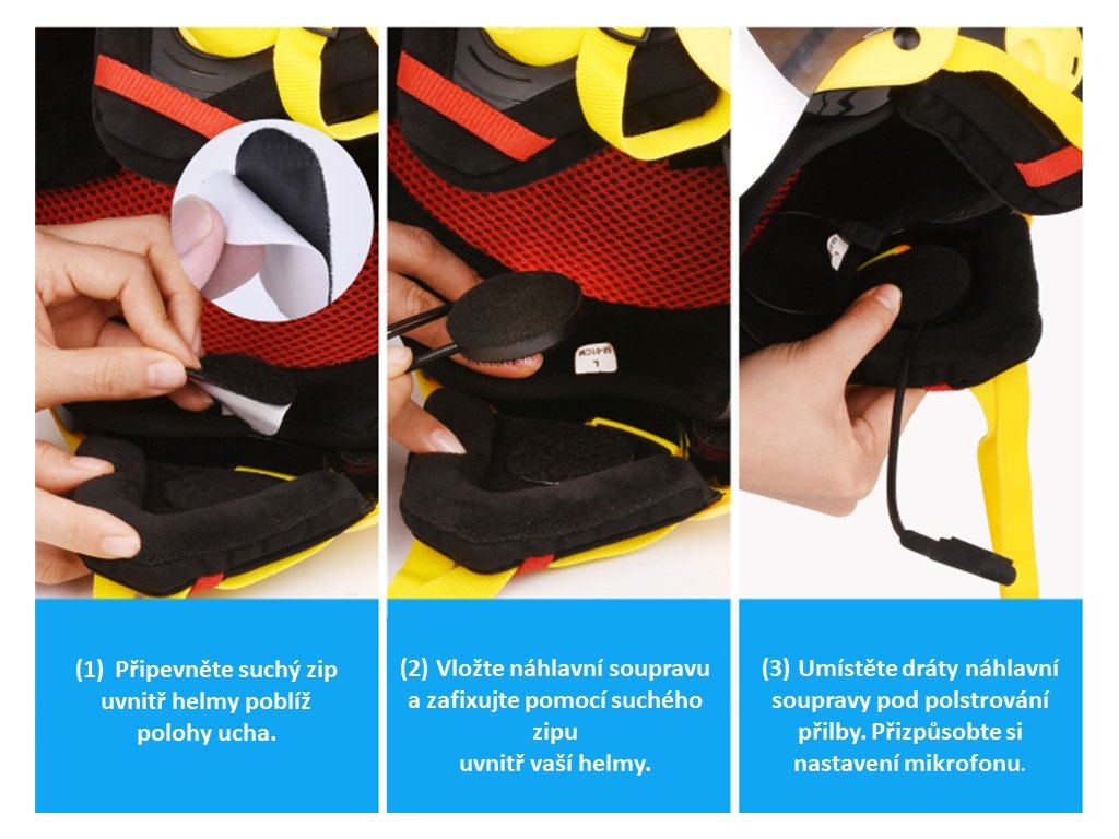 - Obsah balení: jednotka integrována do stereo sluchátek s mikrofonem na pružném držáku proti-šumovým filtrem, sada nalepovací suché zipy, 1x USB kabel.