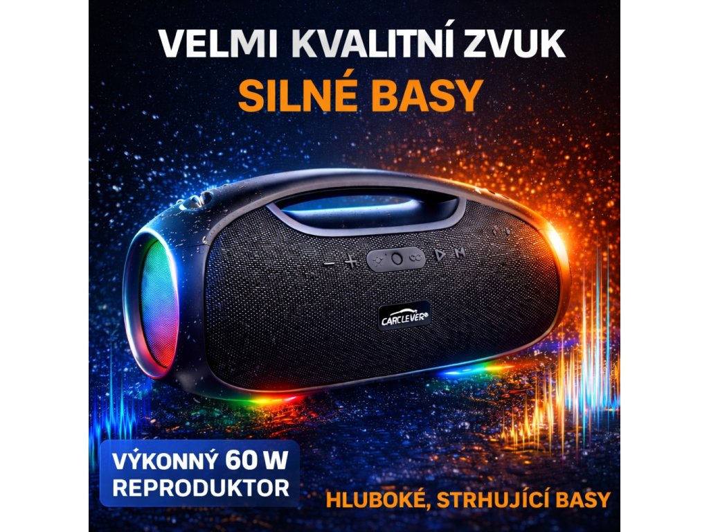 CARCLEVER bezdrátový Bluetooth reproduktor, voděodolný IPX6, USB, AUX, MIC, RGB