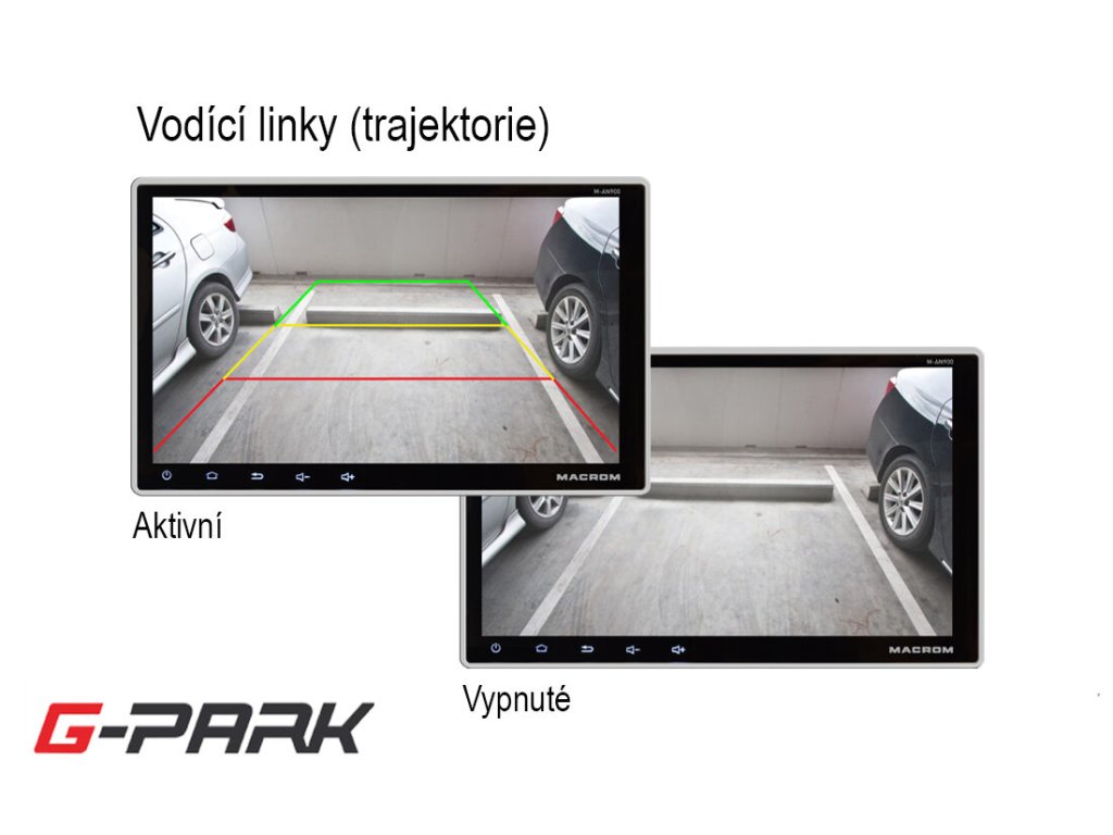 - zobrazuje pomocné trajektorie (vodicí linek) na monitoru pro orientaci při parkování (možno vypnutí)