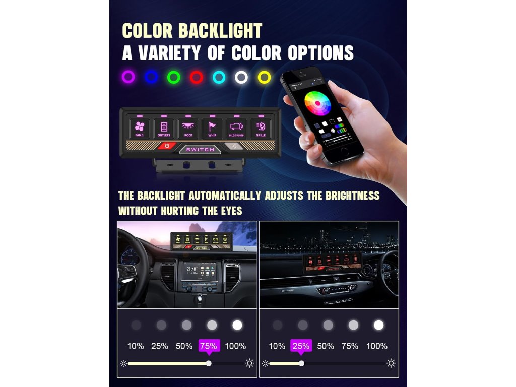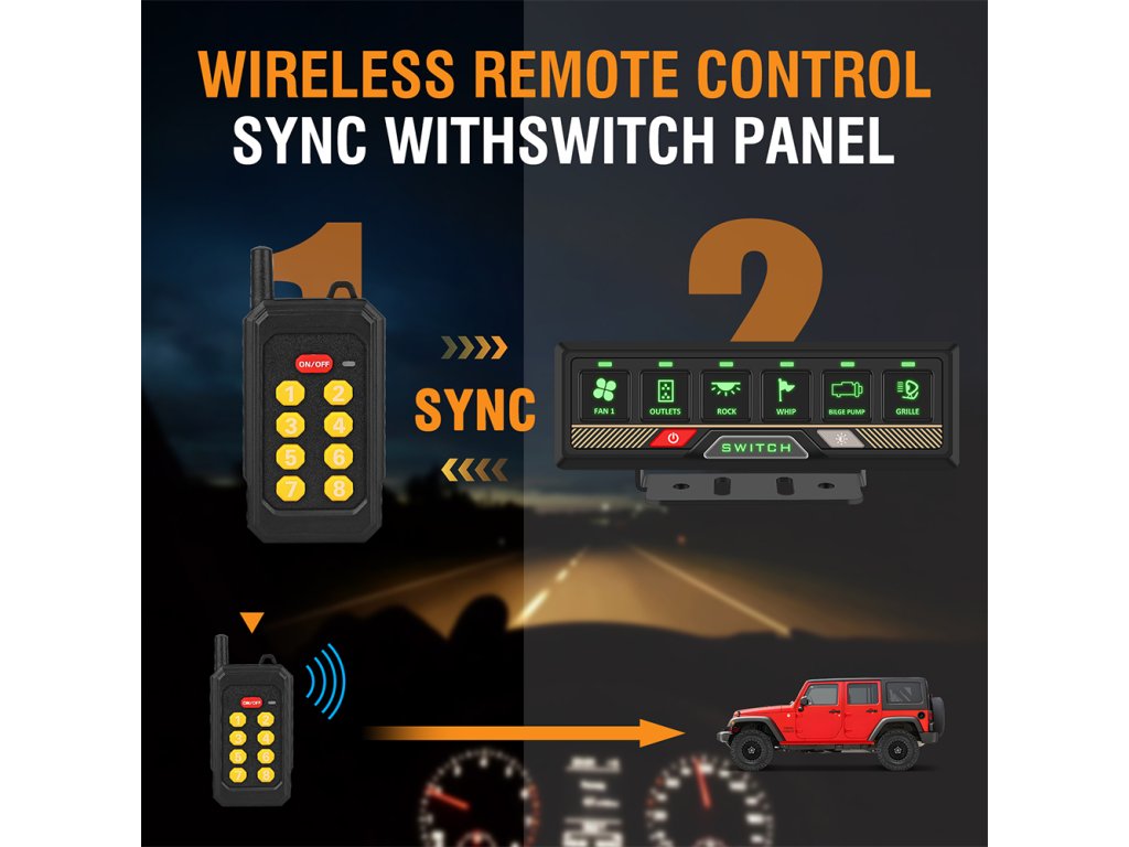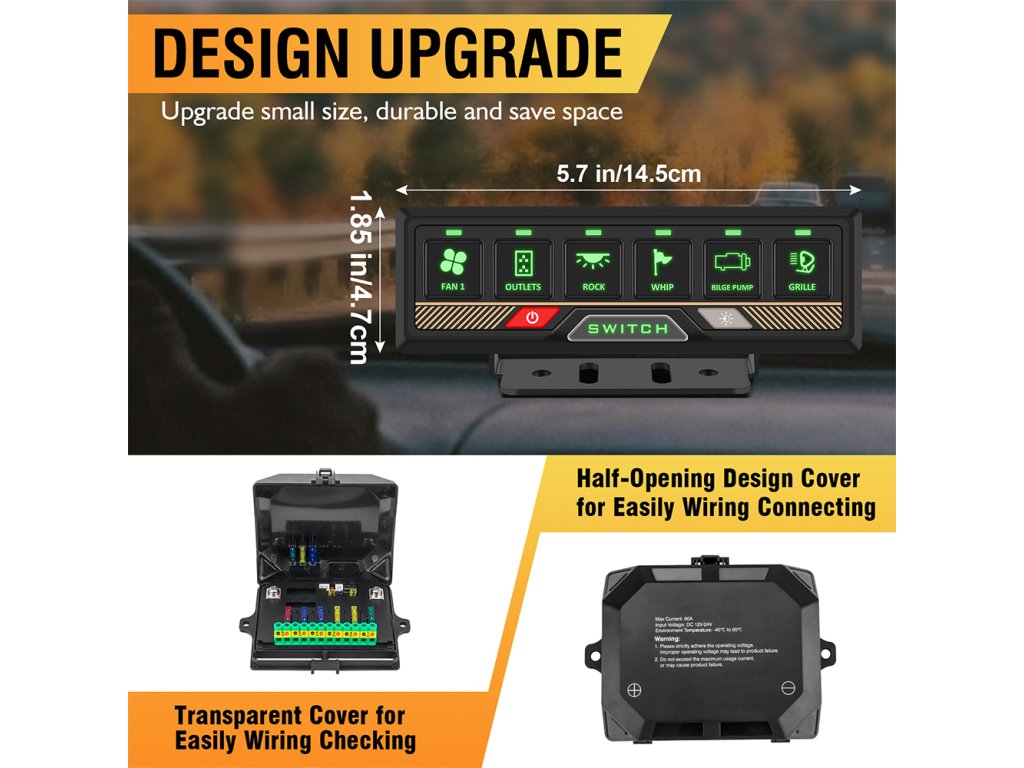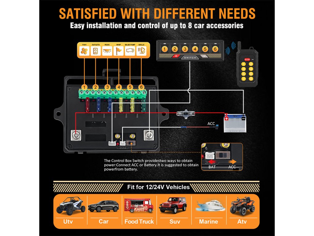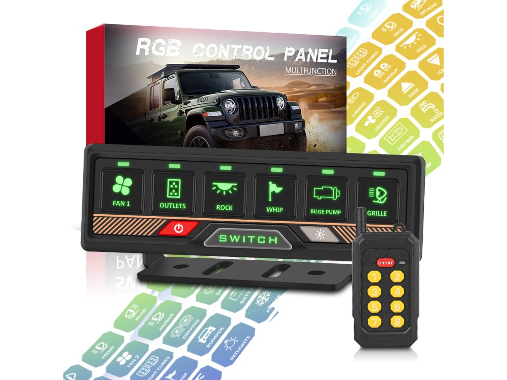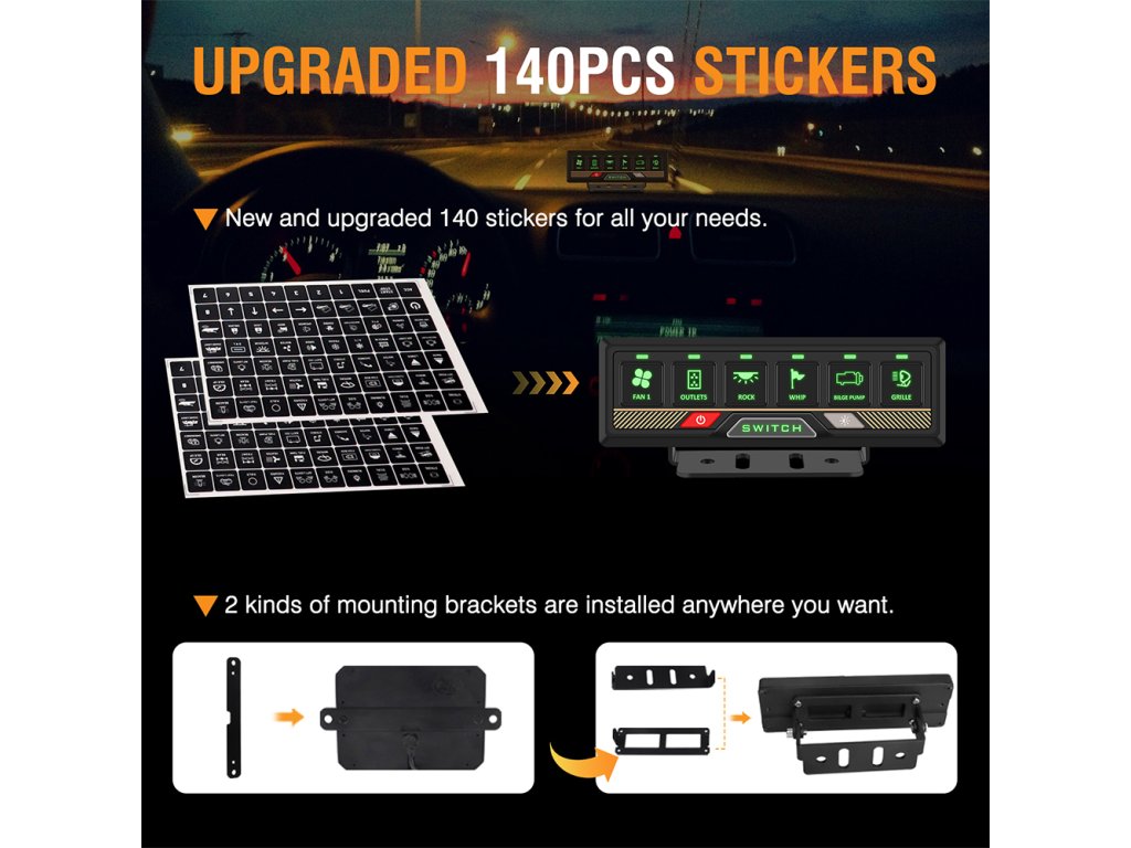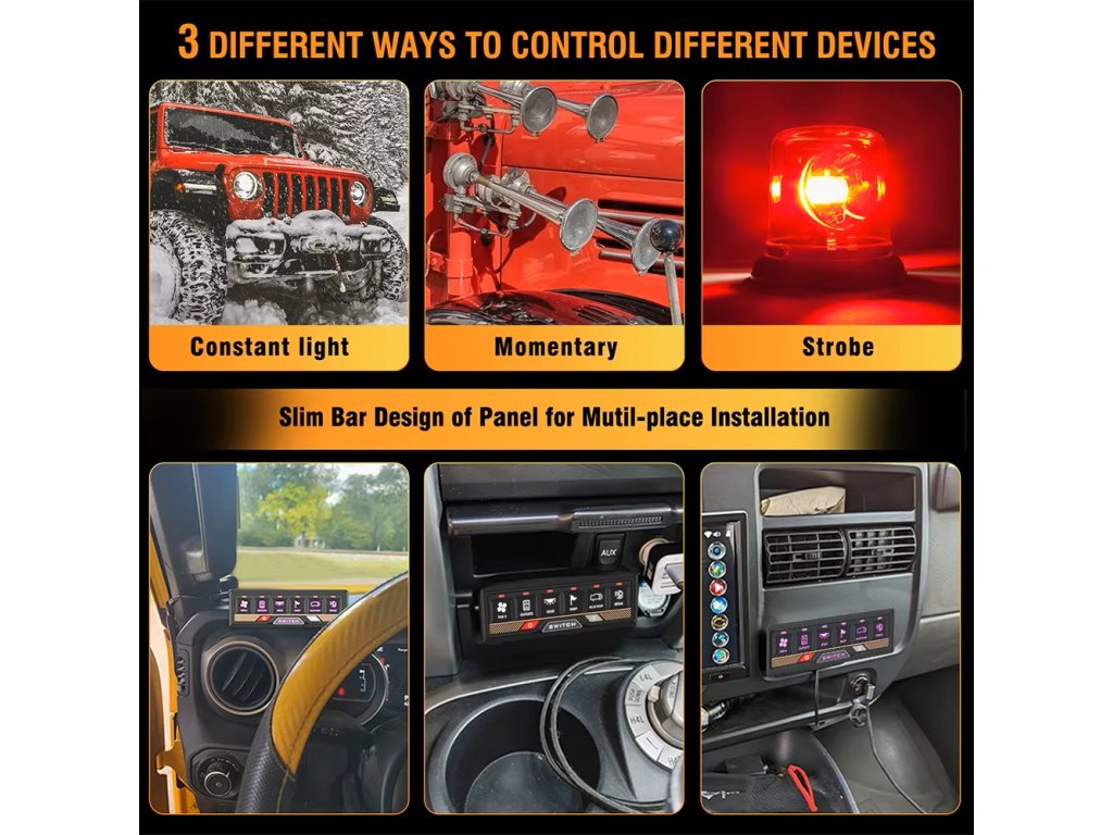 Snadno nainstalujete do 12 V a 24 V vozidel. Je vhodný pro různé typy automobilů, terénní vozidla, pickupy, nákladní vozy atd. Různé spínače pro ovládání obecného elektrického vybavení ve vozidle: světlomety a jiná zařízení. Ovládací panel lze instalovat na přístrojovou desku, středovou konzolu, sedadlo, strop, A-sloupek ve vozidle atd. Možnost ovládání z mobilního telefonu přes Bluetooth pomocí aplikace Mgroup light, nebo pomocí přiloženého dálkového ovladače. Přizpůsobitelné samolepicí štítky, které vám pomohou určit každé tlačítko podle vašich konkrétních potřeb (celkem 140 ks).
