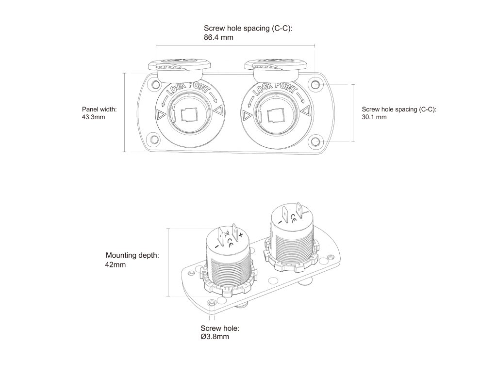 Tuto CL zásuvku můžete nainstalovat do jakéhokoli vozidla s napětím 12 V - 24 V DC. Vyvrtejte otvor o průměru 29 mm na místo, kam chcete zásuvku nainstalovat, zasuňte ji do otvoru a pevně ji upevněte pojistnou maticí. Připojte dva ploché terminály 6,3 mm značené polaritou + / - k pólům "+" a "-" baterie vozidla pomocí vodičů (dodržte polaritu připojení nebo může dojít k poškození zařízení).