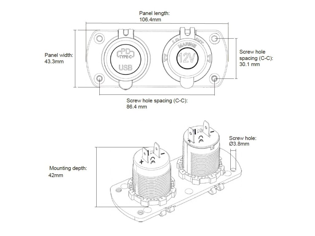 Dvojitá zásuvka do panelu 1x CL (max. 20 A) + 2x nabíječka USB voděodolná.