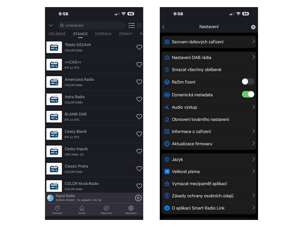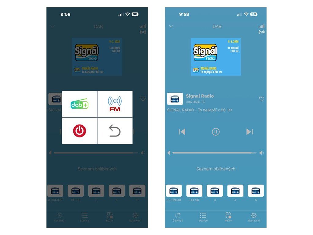 • Možnost ovládání přehrávání, výběr stanic, ukládání oblíbených, informace o signálu