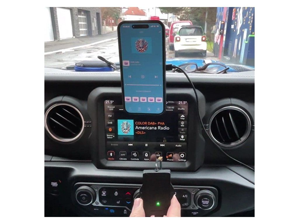 Pro instalaci za rádio s možností přenosu zvuku pomocí FM modulace a připojení na napětí palubní desky vozu s ovládáním přes APP, je možno využít modul s kódem dab-PS-125BF.