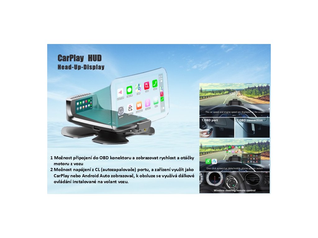 HEAD UP DISPLEJ se zobrazením CarPlay + Android Auto, reflexní deska
