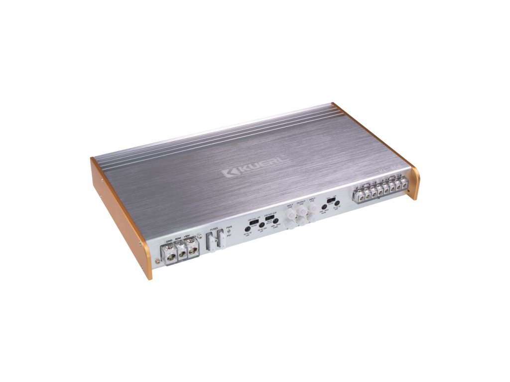 Plášť zesilovače je vyroben zlatě / stříbrně eloxovaného hliníku a logem KUERL.