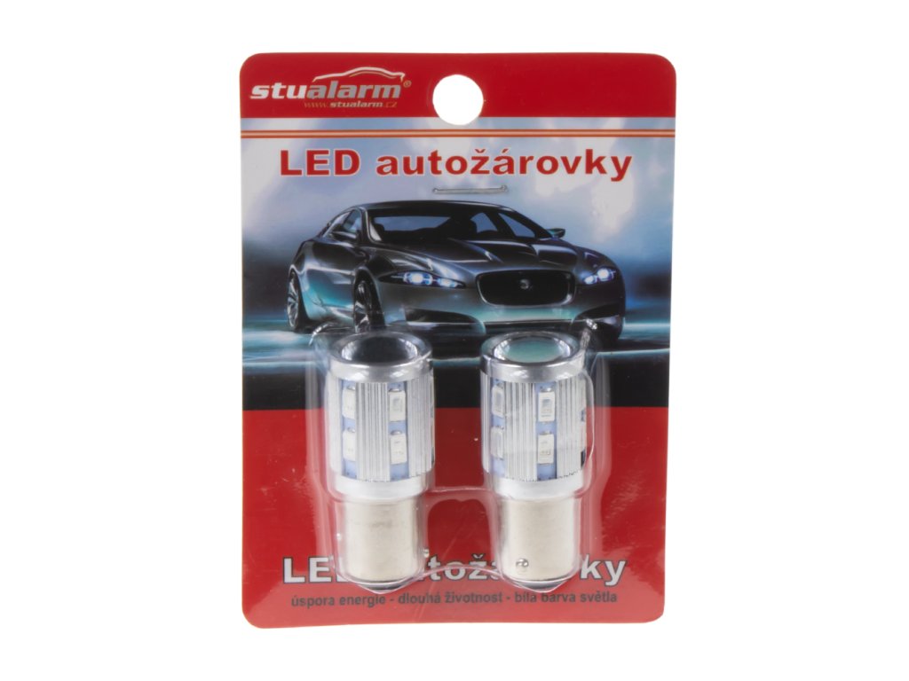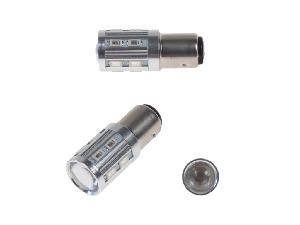 Nová generace LED autožárovek s paticí BAY15D (P21/5W) - dvouvláknová, červená, zepředu 1x super svítivý LED čip 3 W + rozptylová krycí čočka, z boku 12 SMD LED 5630.