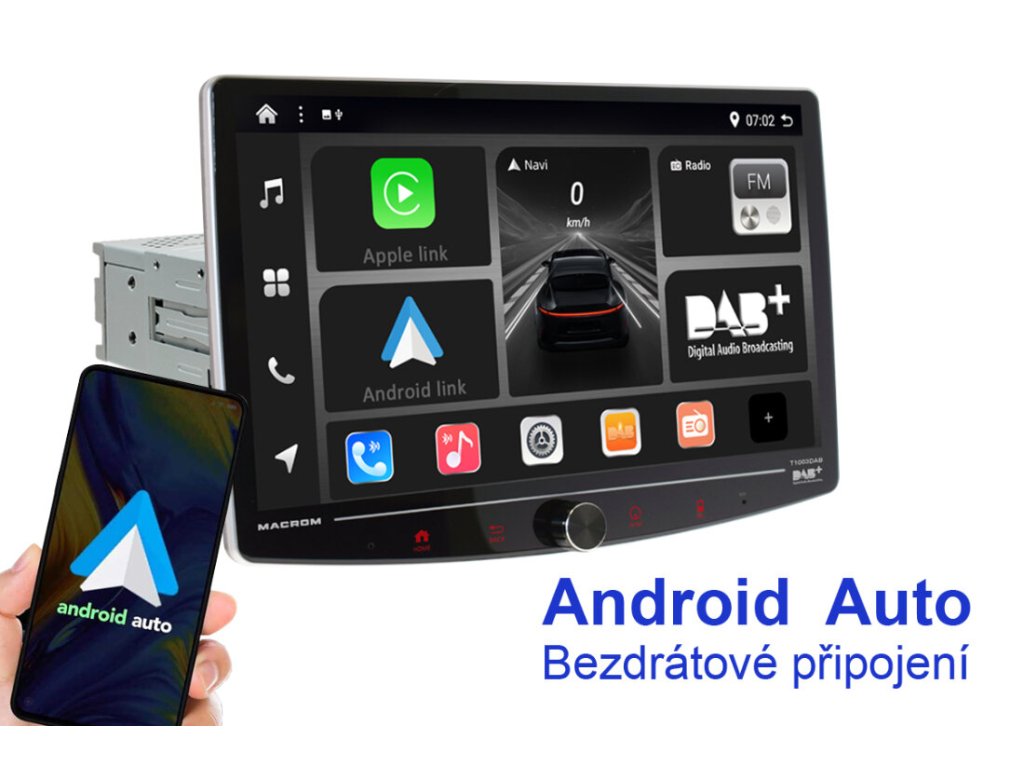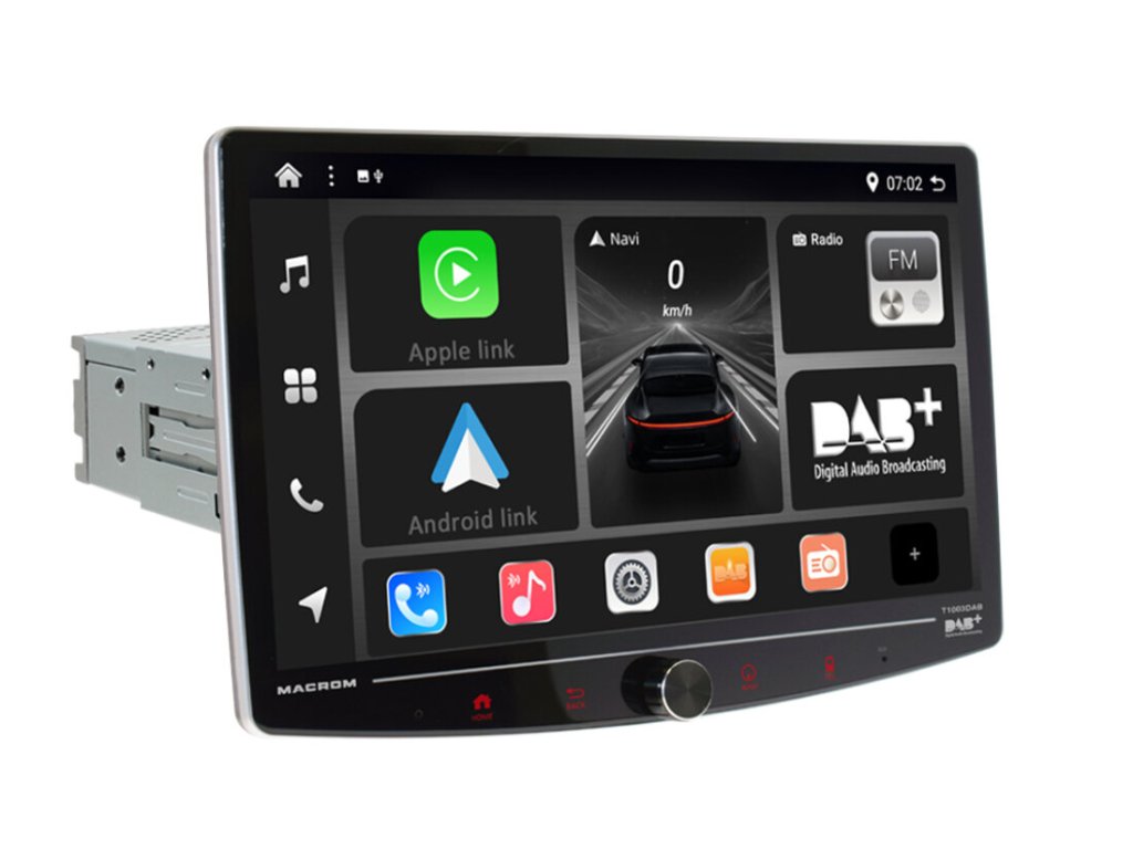 MACROM T1003DAB změní váš automobil na moderní infotainment centrum s multimediálním monitorem Elegantní 10" QLED kapacitní displej s možností natočení vám poskytne dokonale ostrý obraz, zatímco 8 jádrový procesor a Android 13 zajistí bleskovou odezvu.