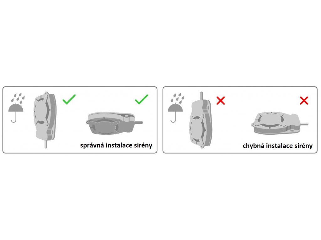 Siréna musí být namontována v poloze, která zabraňuje hromadění vody v krytu.