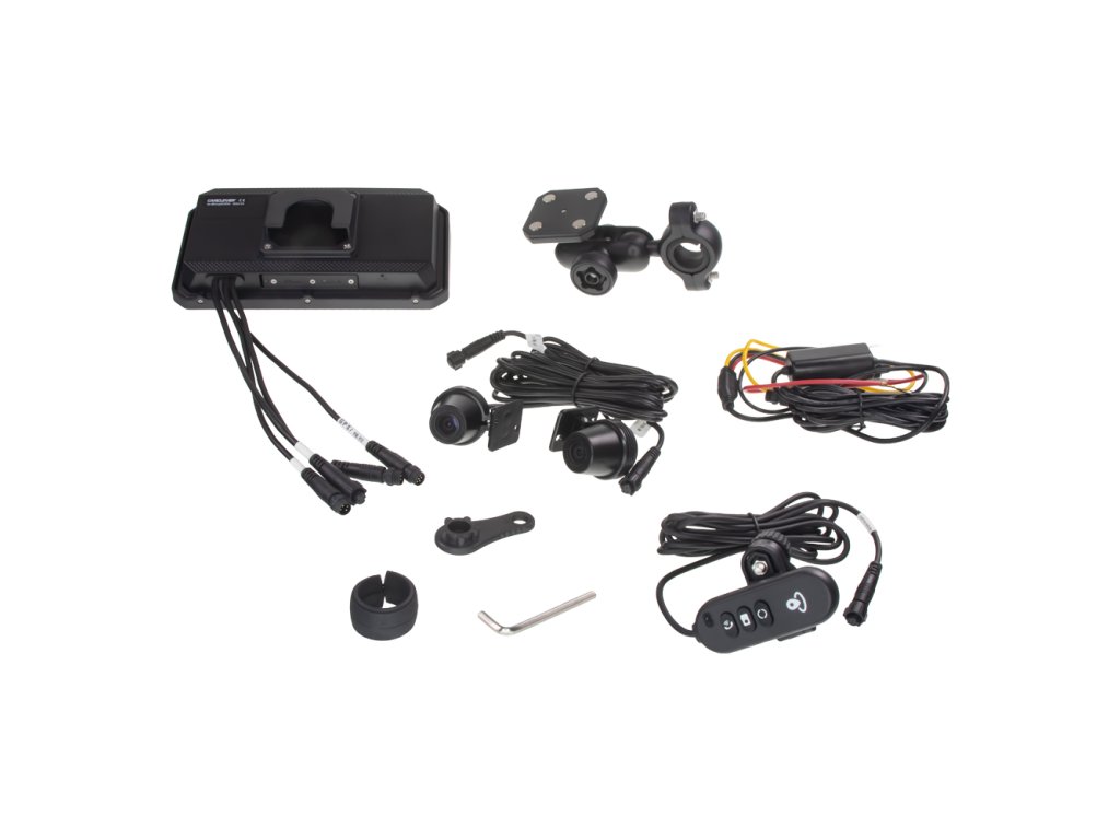 • Délka kabelů: Zadní kamera 240 cm, Přední kamera 115 cm, DO s GPS na řidítka 195 cm, Napájecí kabeláž 260 cm.