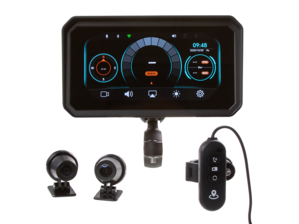 Monitor s dotykovou 6" obrazovkou na motocykl (Plug and Play, vhodné pro všechny motocykly) je dodáván se silným kloubovým držákem s možností instalace na řídítka.