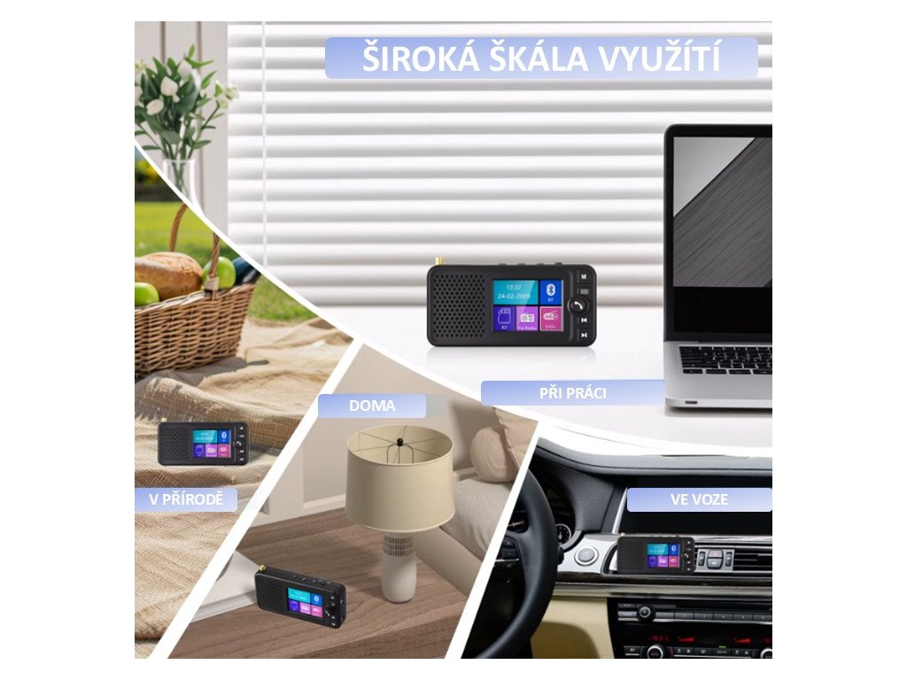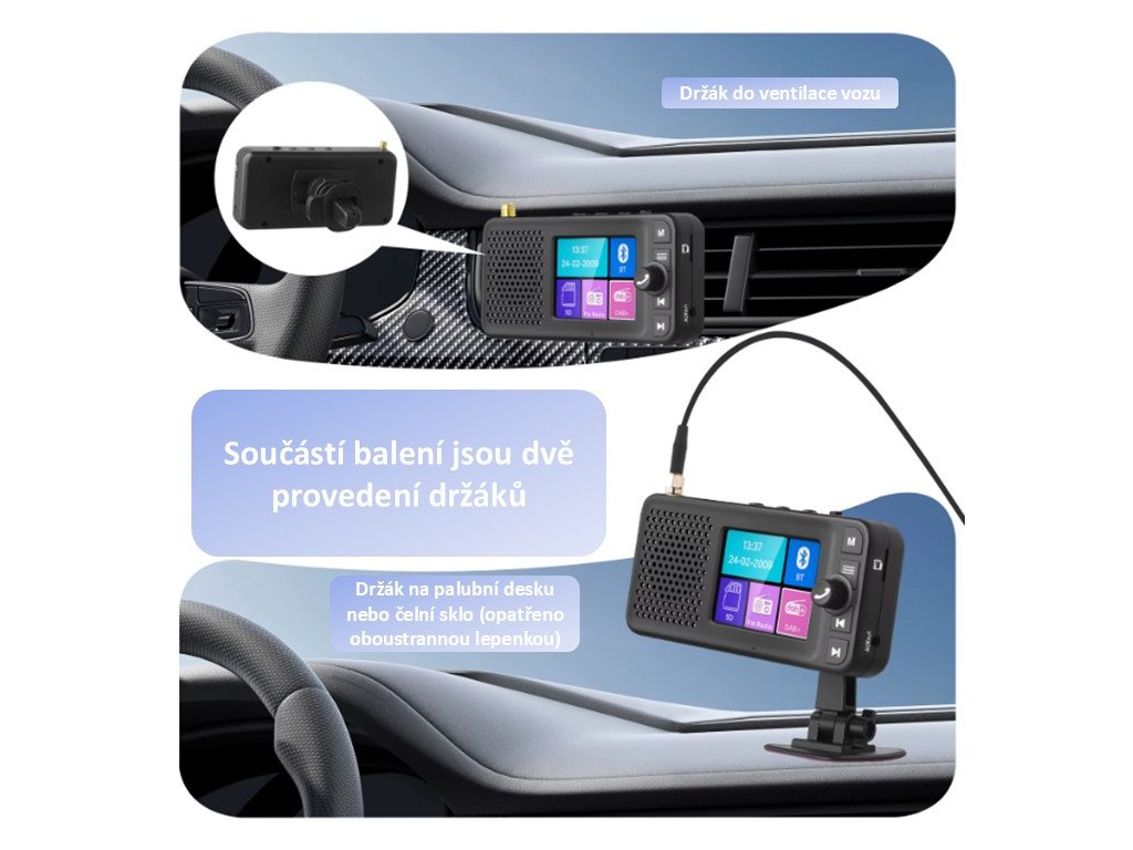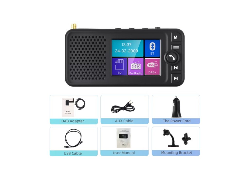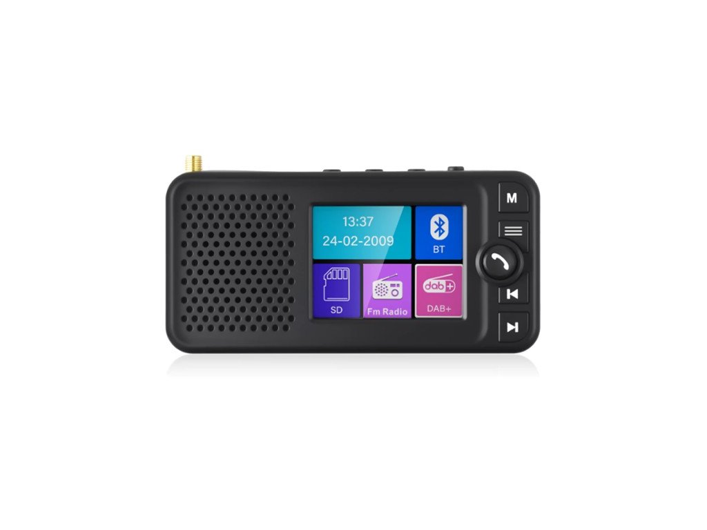 Tento přijímač umožní přijímat digitální rozhlasové vysílání DAB / DAB+ a příjem FM. Přenos zvuku do autorádia probíhá přes FM modulátor nebo pomocí AUX výstupu, pro venkovní použití je integrován reproduktor.