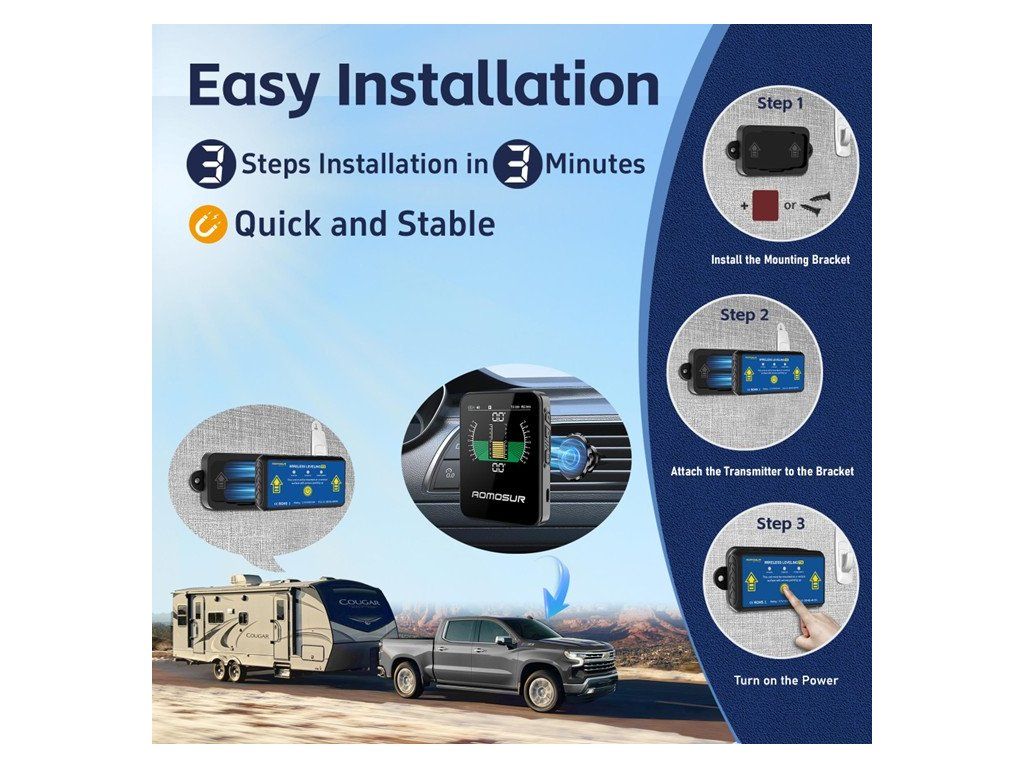 Náklonoměr pro karavany s bezdrátovým displejem je zařízení určené k měření náklonu vozidla, což usnadňuje jeho přesné vyrovnání na nerovném terénu.