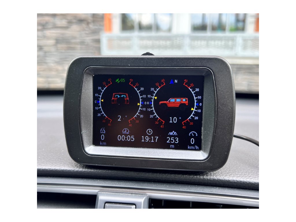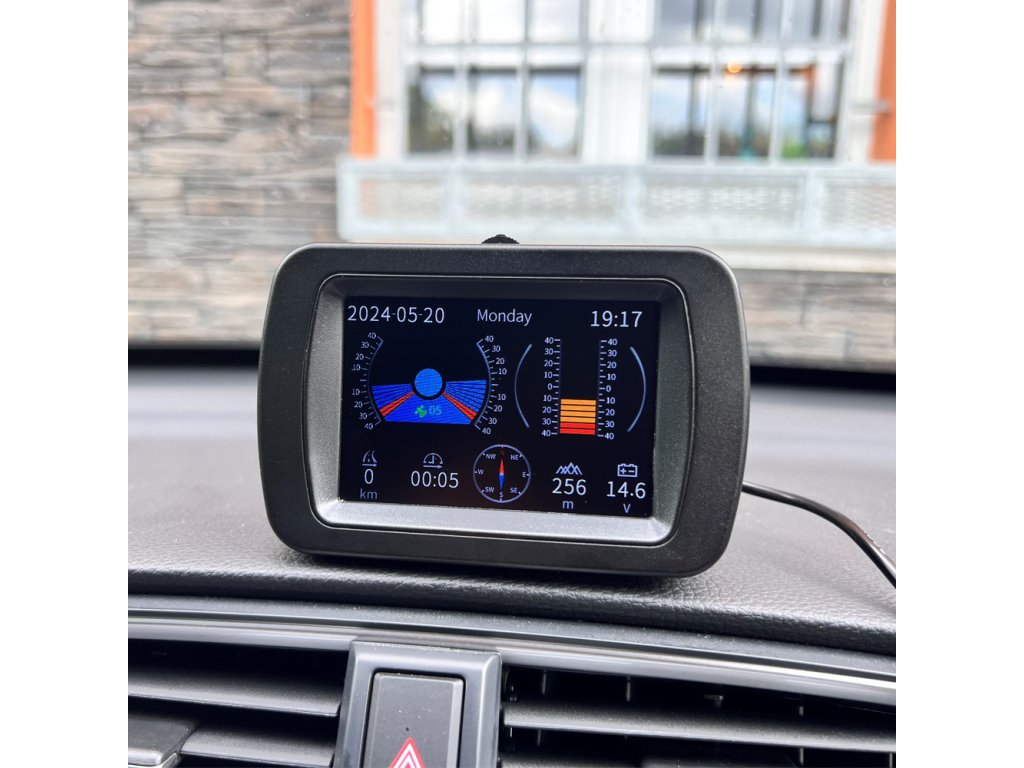 Palubní displej, s vestavěným víceosým gyroskopem a GPS systémem, který dokáže měřit sklon a náklon,