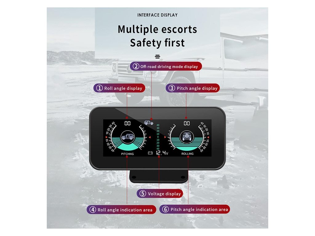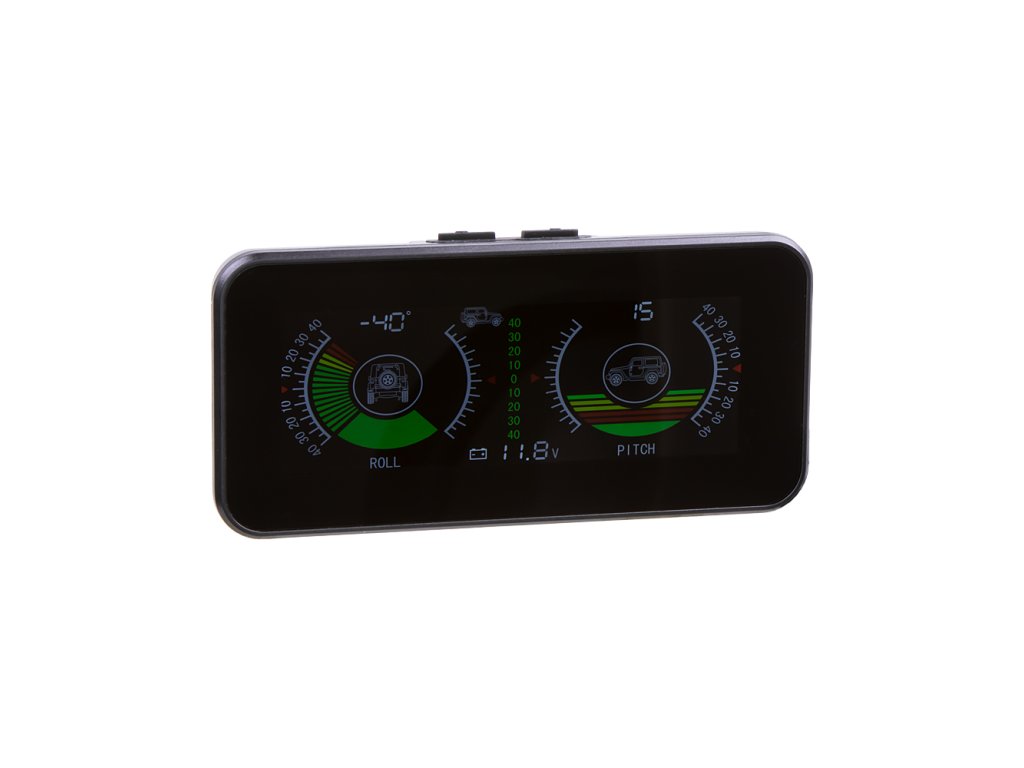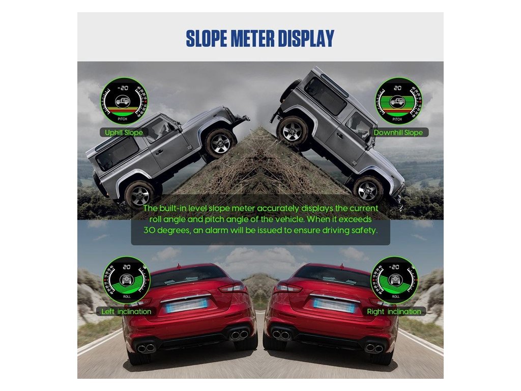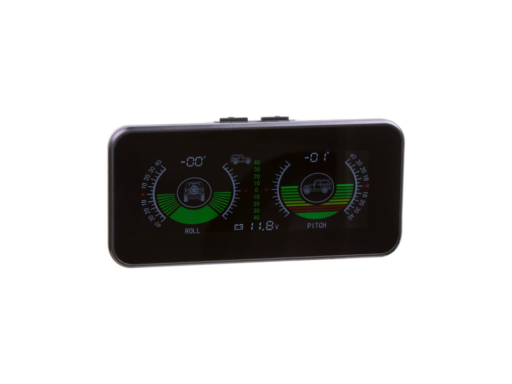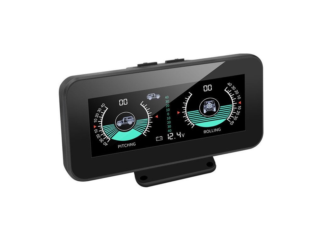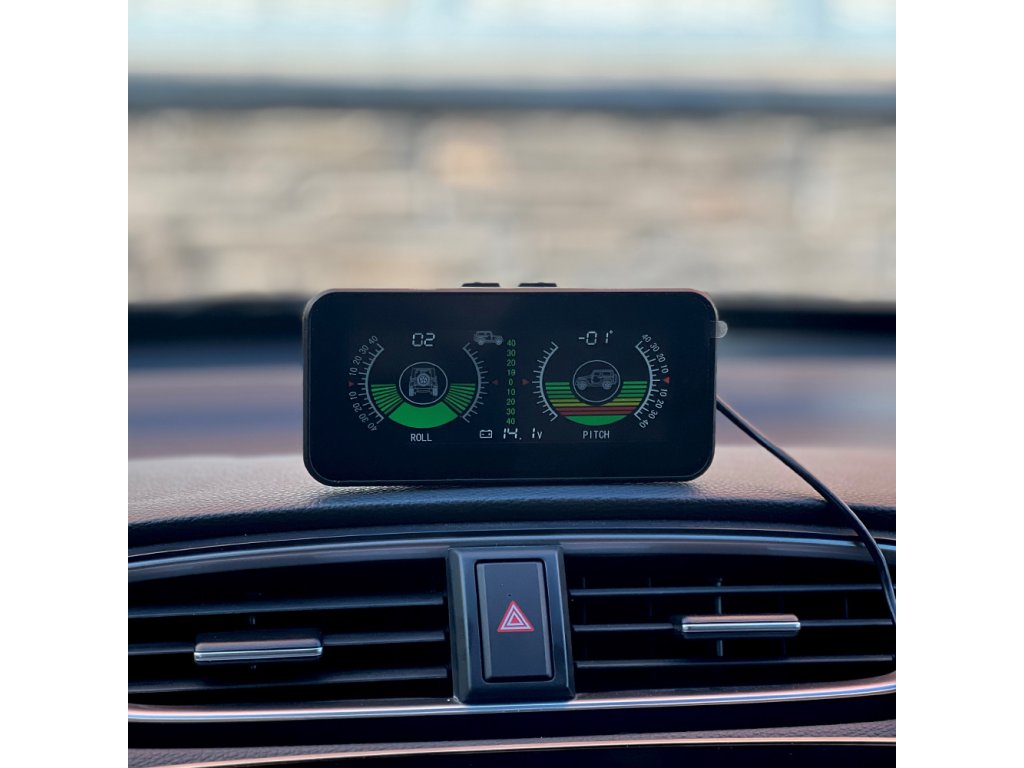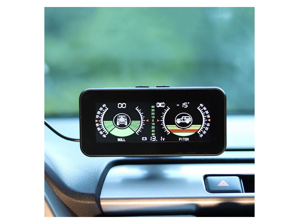 Palubní displej s vestavěným víceosým gyroskopem, který dokáže měřit sklon a náklon, stupeň sjezdu a stoupání vozidel během jízdy, napětí baterie na přehledném barevném LCD displeji.