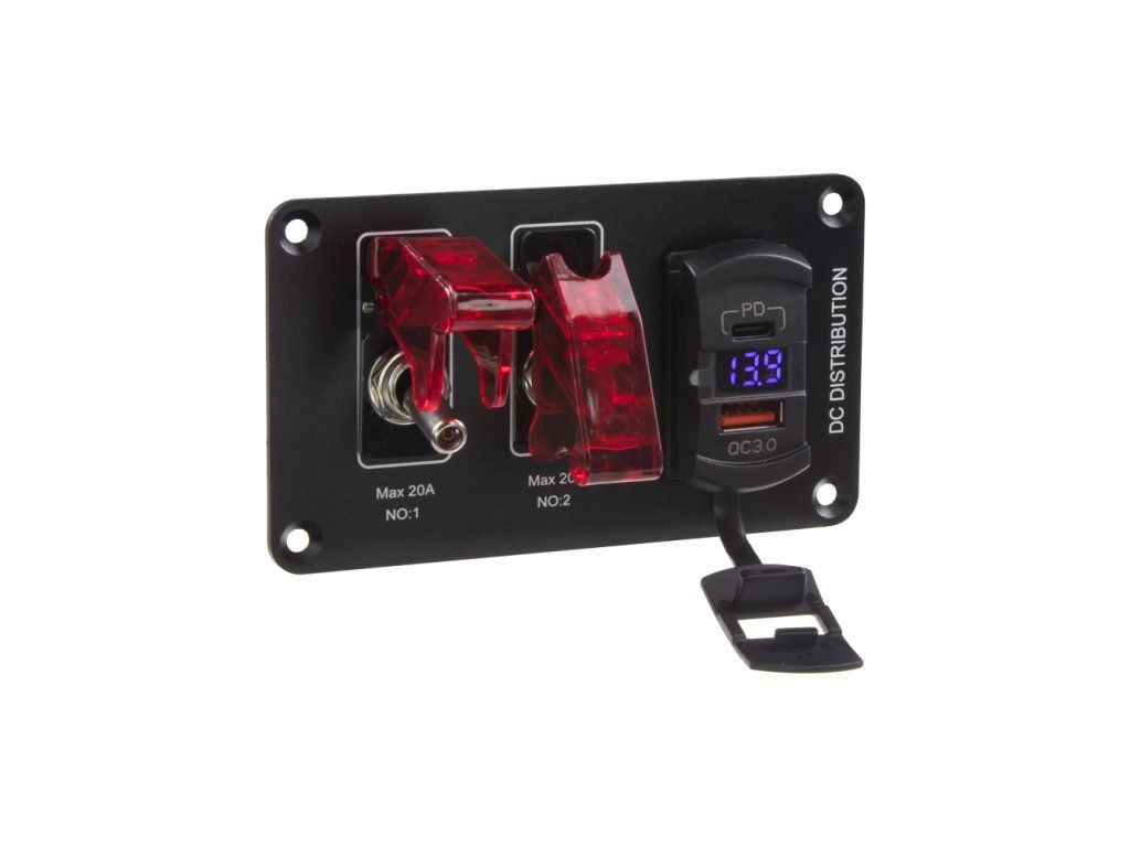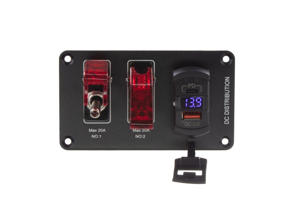 Panel s 2x spínači a USB + USB-C zásuvkou s voltmetrem.