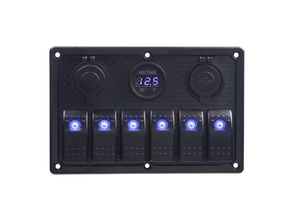 Panel s 6x spínači Rocker, voltmetr, CL + USB zásuvka, 12/24V