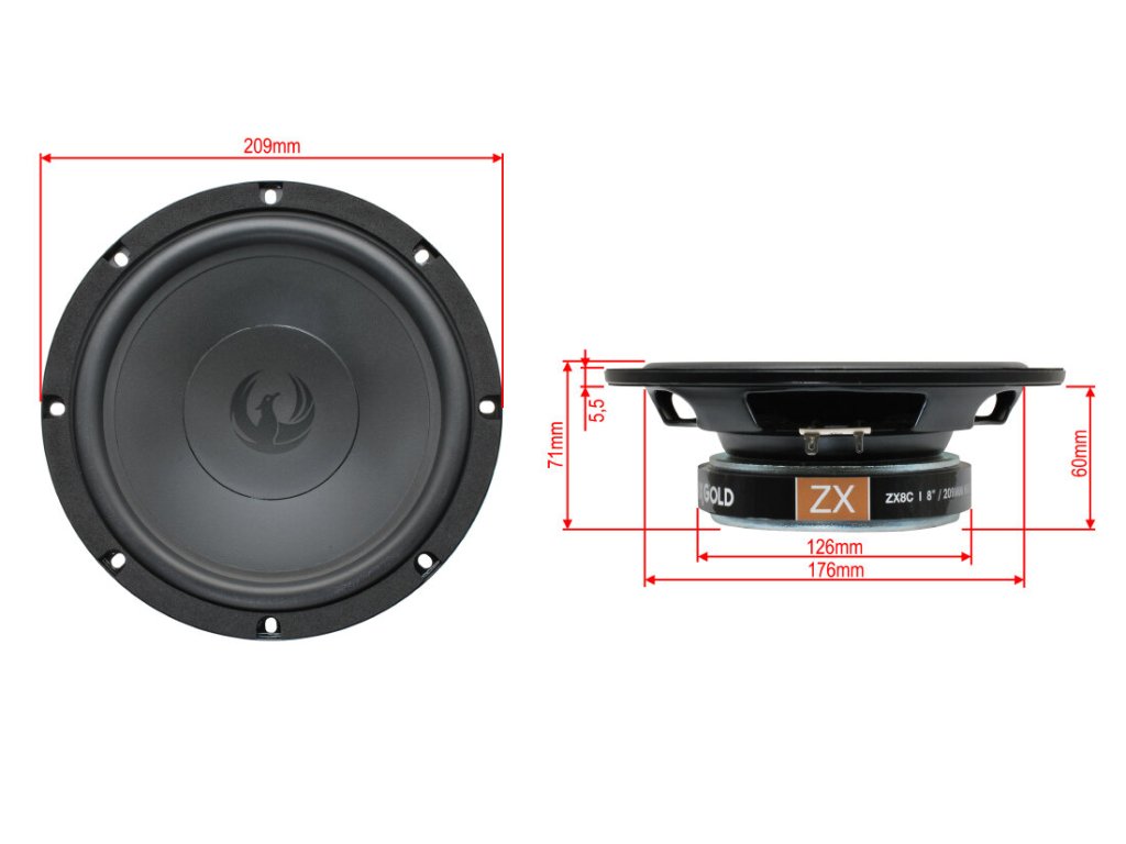 ZX8C 8″ (200mm) středobasový woofer spojuje odolnost s vynikajícím zvukovým výkonem. Díky kompaktní montážní hloubce pouhých 60 mm se hodí do široké škály vozidel. Prodává se v páru a je ideální pro použití v 2pásmových i 3pásmových systémech.