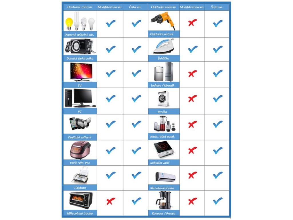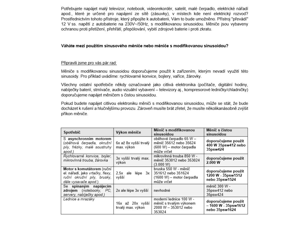 UPOZORNĚNÍ: Váháte mezi použitím sinusového měniče nebo měniče s modifikovanou sinusoidou? Mezi obrázky naleznete tabulku s doporučeným výkonem měničů. Od 14.9.2015 již nebudeme brát při reklamaci zřetel na přetížený měnič.