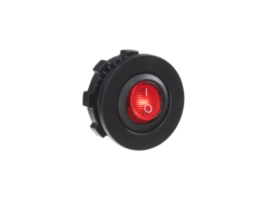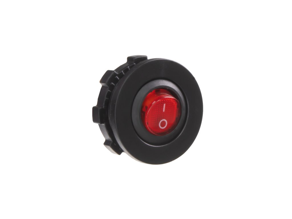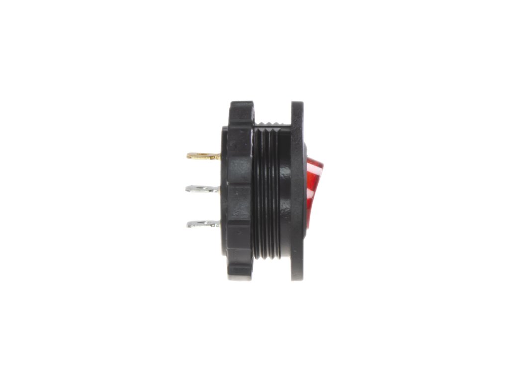 Spínač kolébkový kulatý 20A červený s podsvícením. Spíná kladné napětí mezi kontakty 1 a 2, na kontaktu 3 je kostra pro podsvícení.