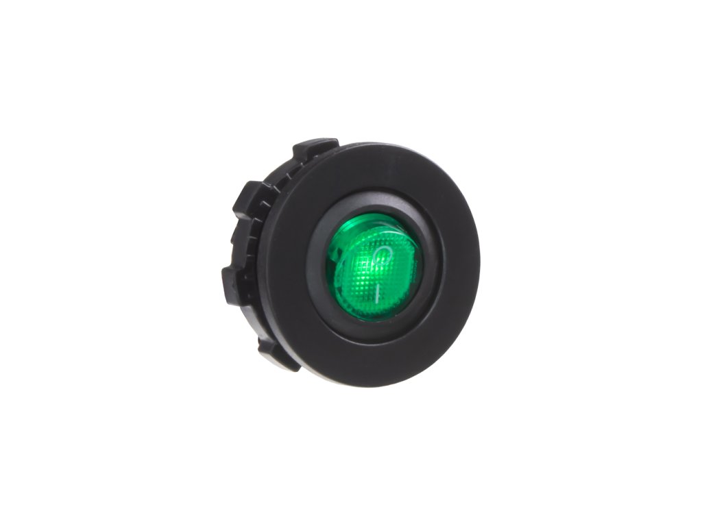 Spínač kolébkový kulatý 20A zelený s podsvícením. Spíná kladné napětí mezi kontakty 1 a 2, na kontaktu 3 je kostra pro podsvícení.