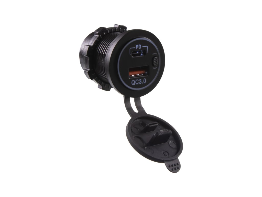 USB nabíječka do panelu, QC3.0 + USB-C, s krytkou proti prachu a vlhkosti.