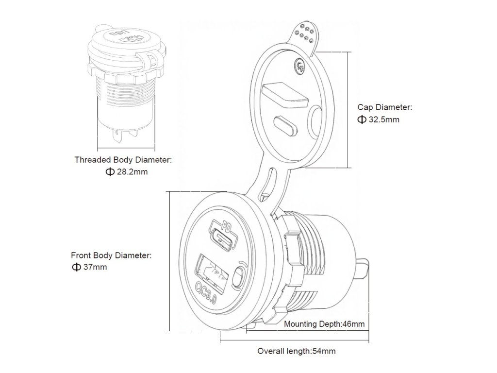 USB nabíječka do panelu, QC3.0 + USB-C, s krytkou proti prachu a vlhkosti.