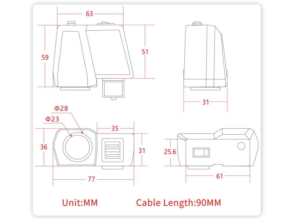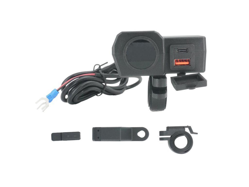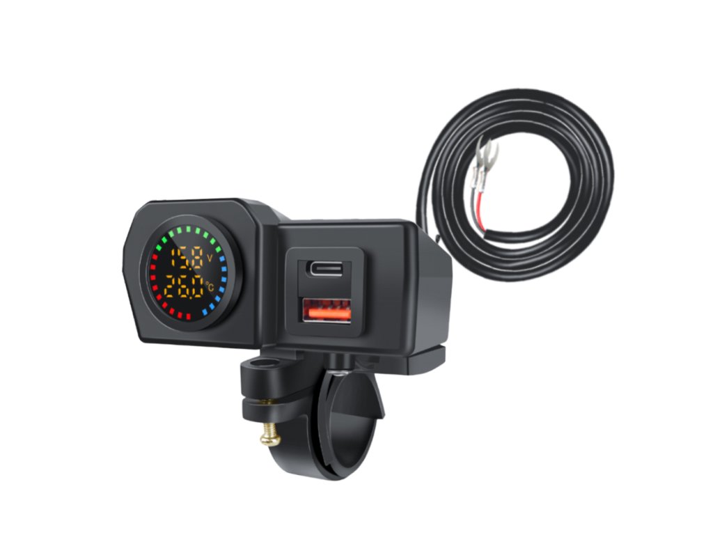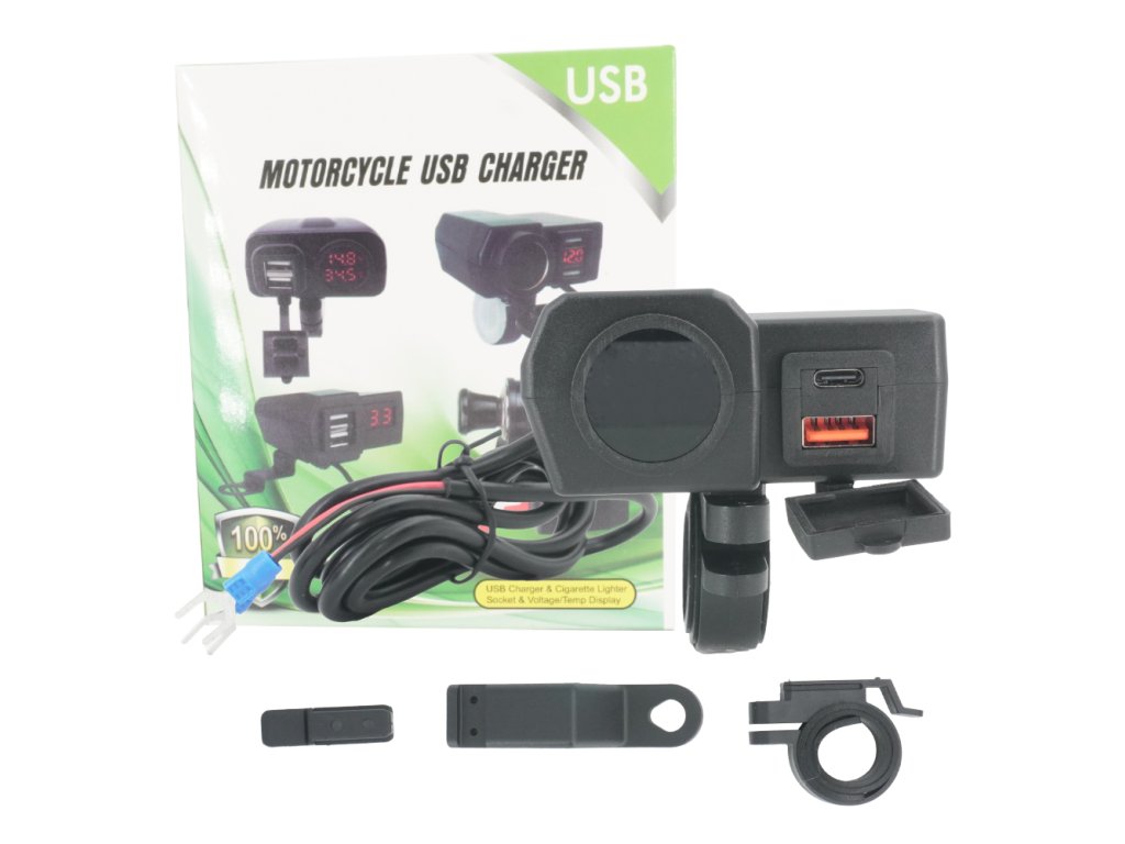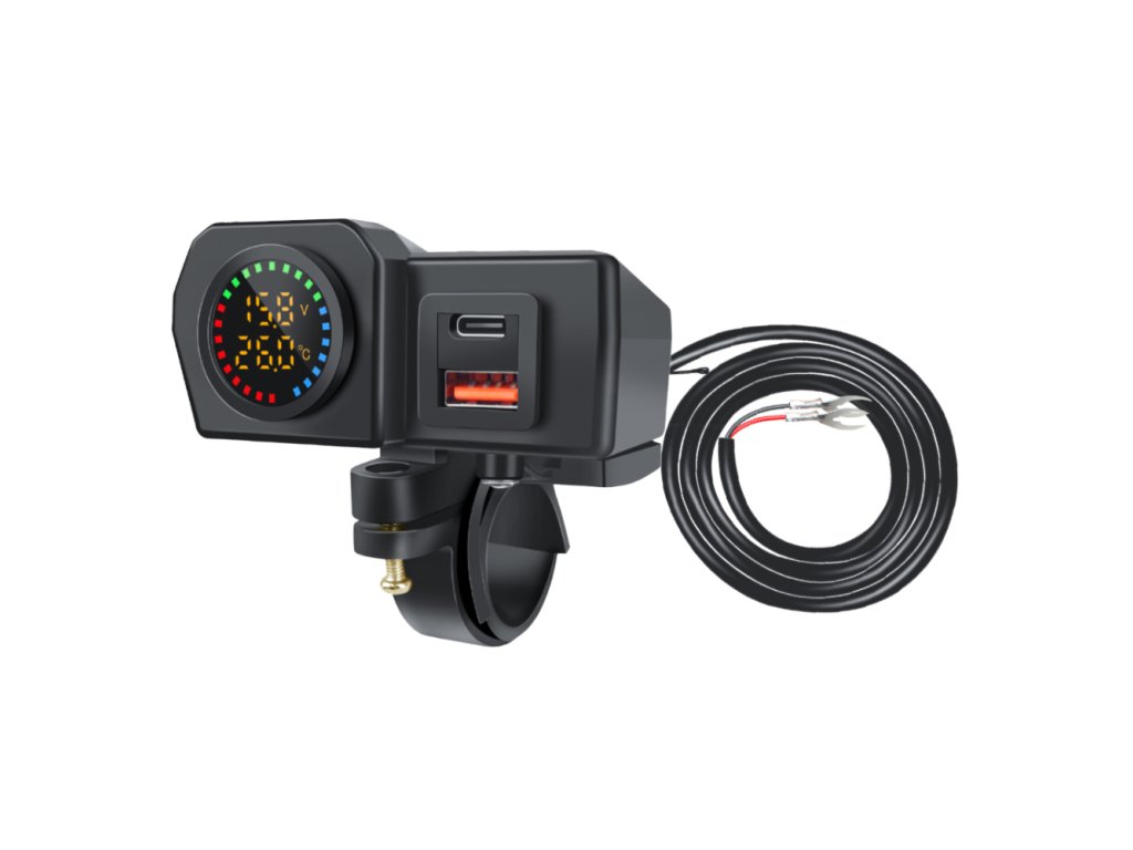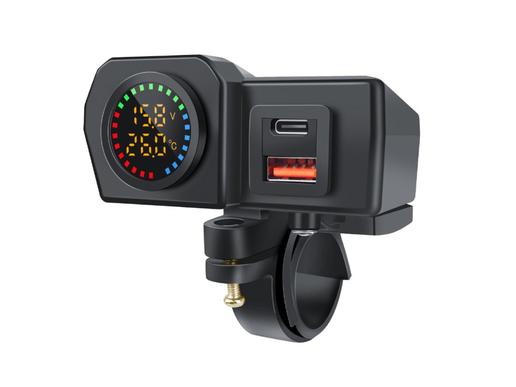 USB+USB C nabíječka s voltmetrem/teploměrem na motocykl