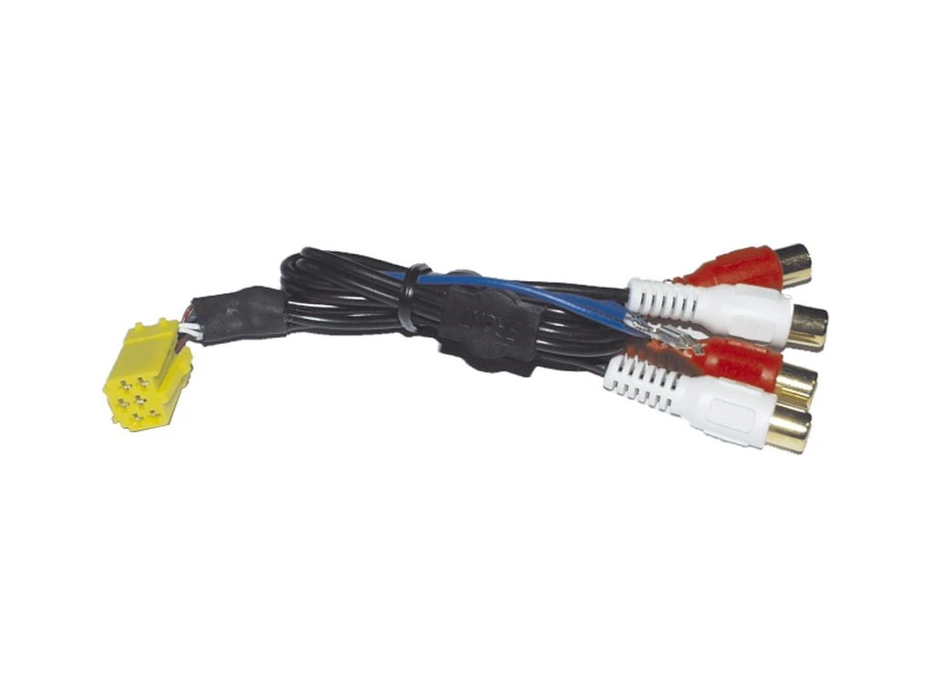 Univerzální konektorová redukce linkového signálu z MINI ISO 6-pin konektoru samec na 4x CINCHový konektor samice, 4-kanálový linkový výstup se používá u autorádií Blaupunkt, Becker, Grundig.